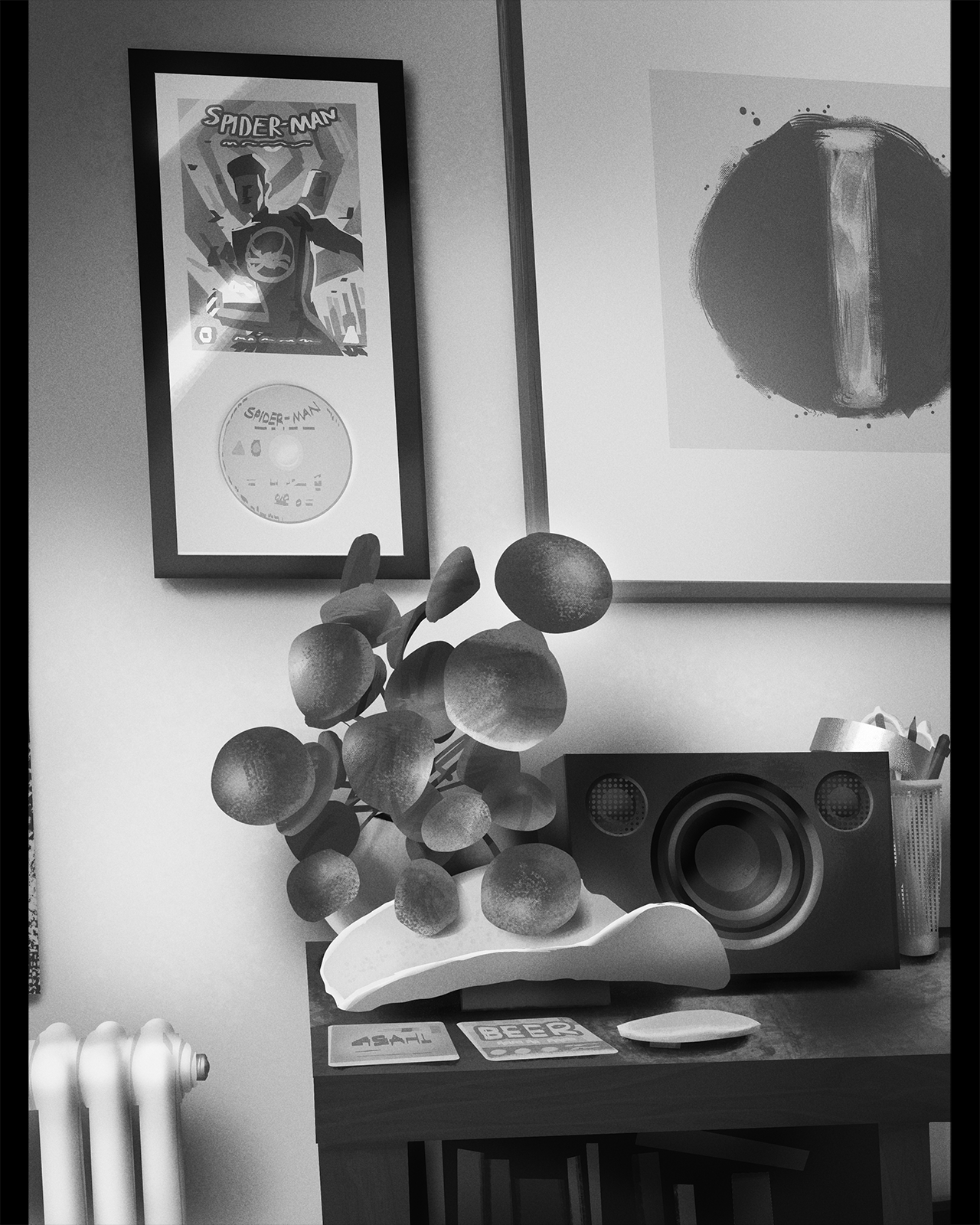 Black & white digital painting study of a corner of my bedroom.
